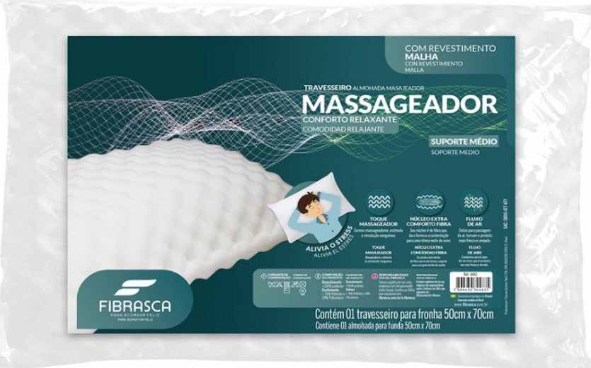 O travesseiro Massageador Fibrasca foi desenvolvido com desenho especial, trazendo uma solução com maior sensação de conforto e alívio do stress do dia a dia. Feito em espuma, o Massageador possui gomos massageadores que estimulam a circulação sanguínea. A capa é feita em malha com toque suave e confortável.