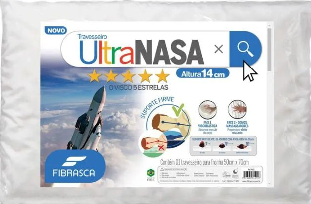 O travesseiro Ultra Nasa e Massageador Fibrasca, suporte super firme, possui o conceito de dupla face e foi desenvolvido para trazer versatilidade e conforto para o sono em um único produto. Com uma face em Visco Elástico (Nasa), se tem a maciez e absorção da pressão do corpo e na outra com espuma perfilada com gomos que trazem o toque Massageador e confortável. A capa em malha proporciona um toque suave e macio ao produto.